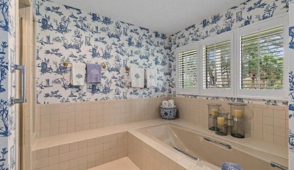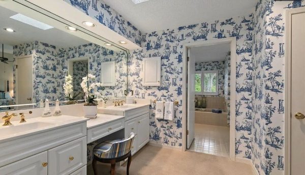The primary suite is a decent size and has a lot of square footage devoted to bath and closet. The bathroom consists of two rooms. You enter the first room through a pair of double doors to dual vanities, a knee space for the lady to do her makeup, and a large mirror running the length of the room. And since it’s on the zero wall, there is a large skylight. So far so good. This room has carpet on the floor and extremely busy wallpaper. These are easy fixes, but so tell tale of that era.