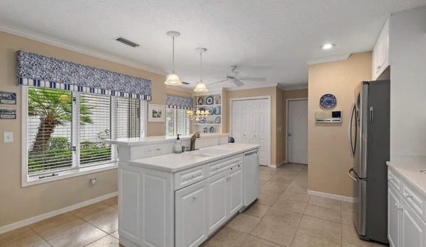 It has an 8’ ceiling and includes a small breakfast nook overlooking the courtyard. Although you don’t have to enter the house through the laundry room, the washer and dryer are in a closet opening onto the breakfast nook. The kitchen does have solid surface countertops and an island (likely a recent alteration) with a 42” high breakfast bar, now considered too high. The original kitchen was likely utilitarian in both design and finishes.