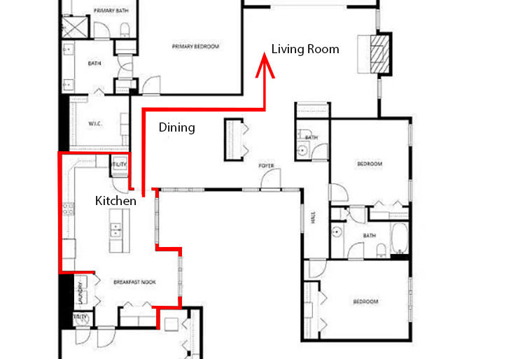 The real issue is how remote the kitchen is from the rest of the home. It’s close to the large formal dining room, but the only access is through a small 3-foot opening. At the time it was built, it was considered gauche to be able to view into the kitchen from the dining room. What’s worse is the kitchen is in the opposite corner of the house from the family room.