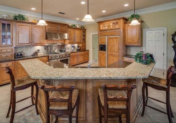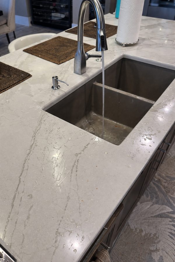 The one negative of the single level island is that there is nothing to contain the water from behind the sink. Even a quick wash of your hands can distribute water everywhere around the sink. If there is enough water, it will eventually find its way off the island and onto the floor, bar stools, or anything in the water’s path.