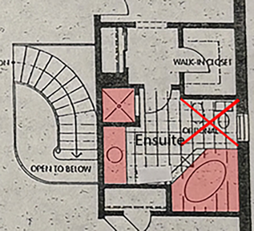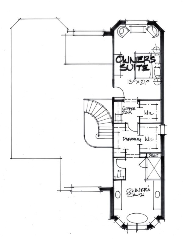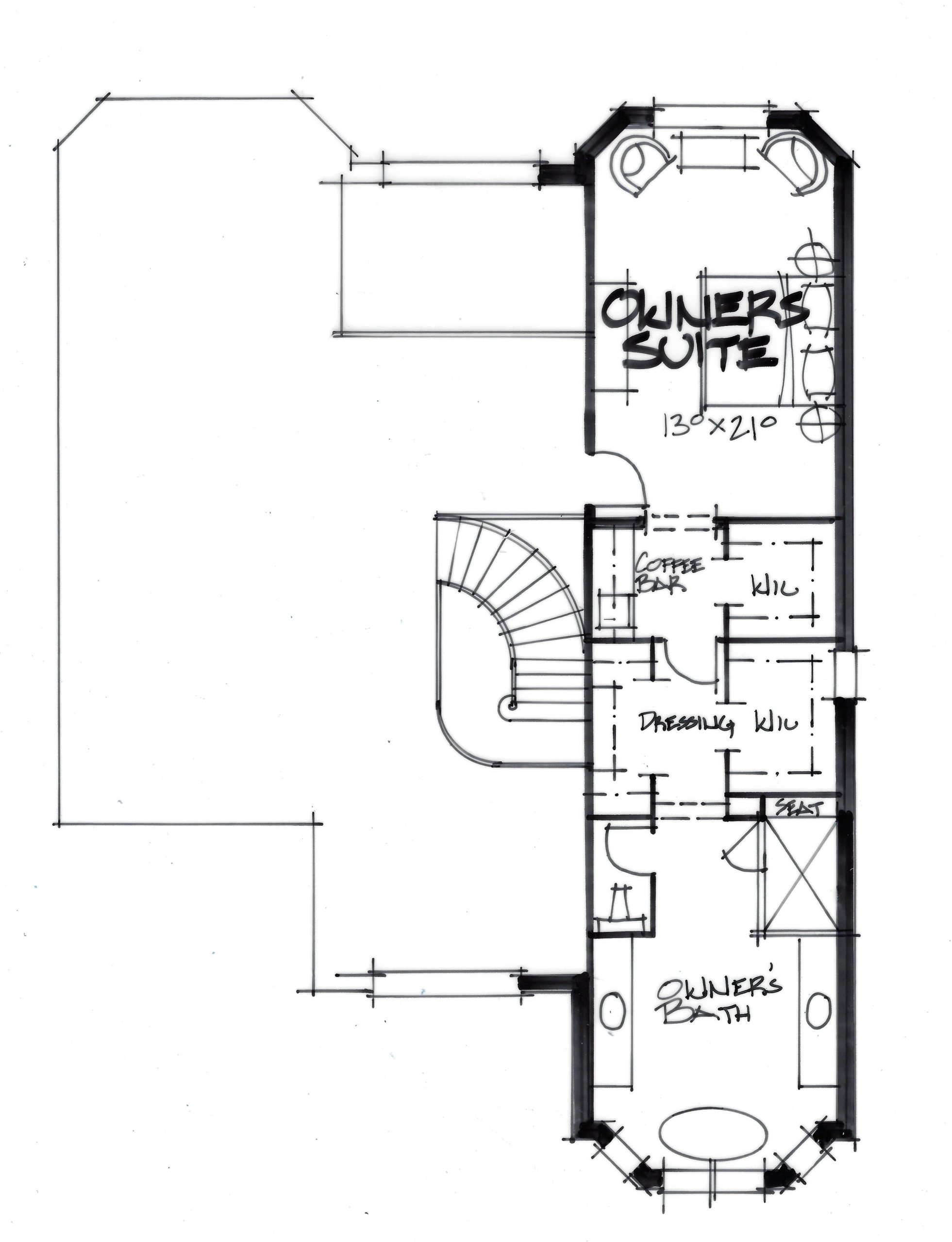 While the primary bedroom is adequately sized, adding a few more feet wouldn’t hurt. However, the bath and the closet are not big enough. Only square footage can fix this problem. And since bedroom two doesn’t work well as a bedroom because of the naked run – I would use it to fix both! Our proposed fix adds three large walk in closets: his, hers and off-season clothes. Just for fun, how about a coffee bar? The bathroom would take advantage of the front bay window and now has his and her vanities, a private toilet room, a large shower, and the free standing tub.