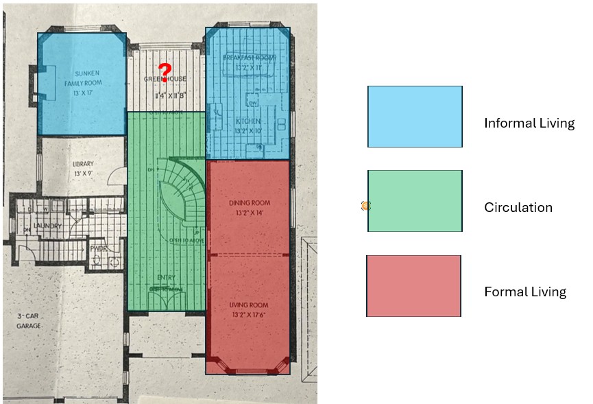 - The Greenhouse. From the pictures, this seems to be an awkward space. Because it is visible from the front door, determining its function is more limited. It is also has difficult proportions – too low to too high in too small of an area.
