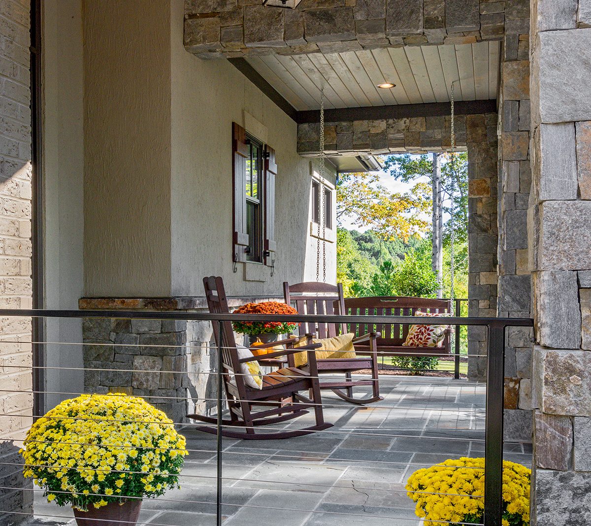 Too often, both critical components of a front porch are simply overlooked. There is nothing welcoming about a plain concrete floor scarred with the bumps and bruises of construction. Consider concrete pavers for warmth and texture or synthetic wood planking. For ceilings, consider a beadboard patterned vinyl. This maintenance-free option provides the look of wood without the concern rot in humid climates. And don’t forget the color! While white works, look at the “haint” blue from historic Charleston. Legend has it that this color would keep the bugs and “haints” away. Does it actually work? When it looks this good, who cares?