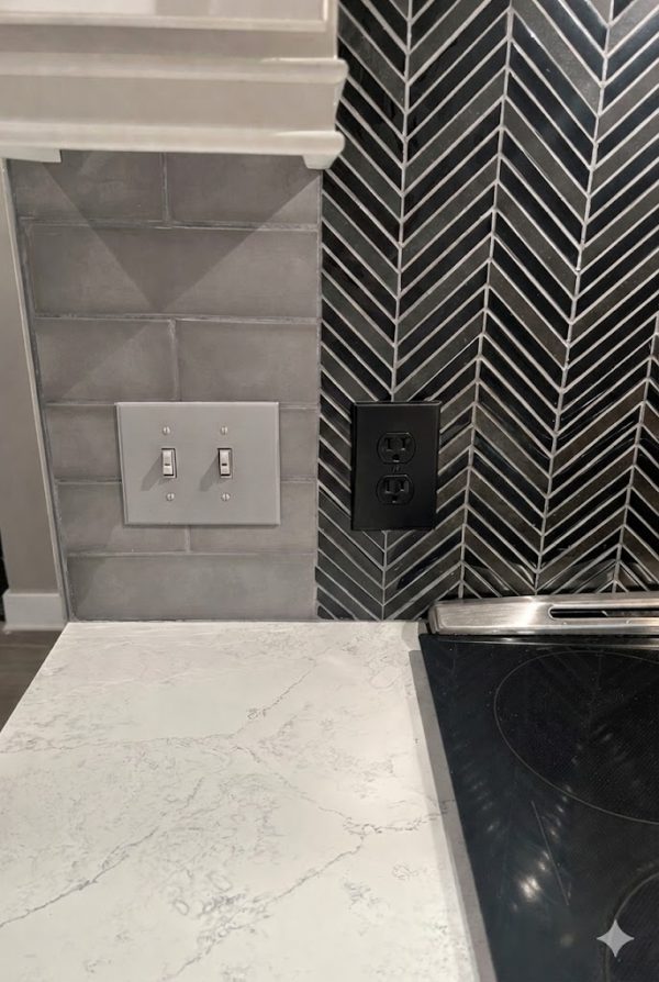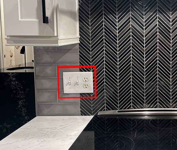 The gray backsplash in the kitchen is still a dilemma. I detest that the outlets and switches are white and not gray. We could change them out to gray – like we did in the primary bath?