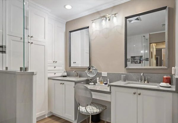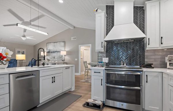 Let’s start with kitchens and bathrooms – you know – the rooms where you can dump a lot of money remodeling. Fortunately for me, I liked the existing kitchen and bath cabinets. The countertops were new and were low maintenance quartz. I even like the contrasting black drawer pulls, farmhouse sink, and faucet.