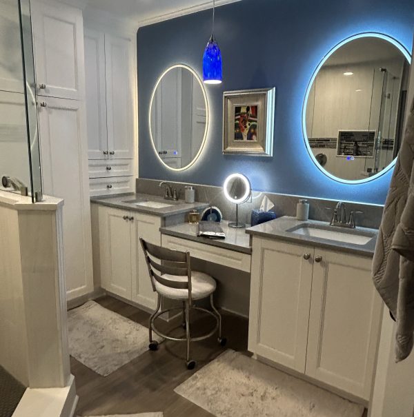 We also added blue to overcome much the gray of the primary bath. This included a blue pendant fixture and a blue wall. We also replaced the mirrors with new back lit mirrors which really accentuate the blue. We could replace the gray accent tile in the shower but – probably not.