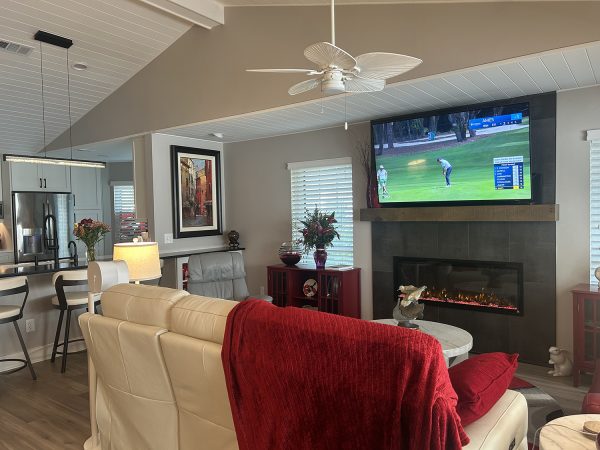 The dark gray tile around the fireplace has become a non-issue. That’s because I so often have the electric fireplace on. I would have never selected an electric fireplace myself, but the glow and playful flames are soothing. I turn it on first thing in the morning while my coffee is brewing.