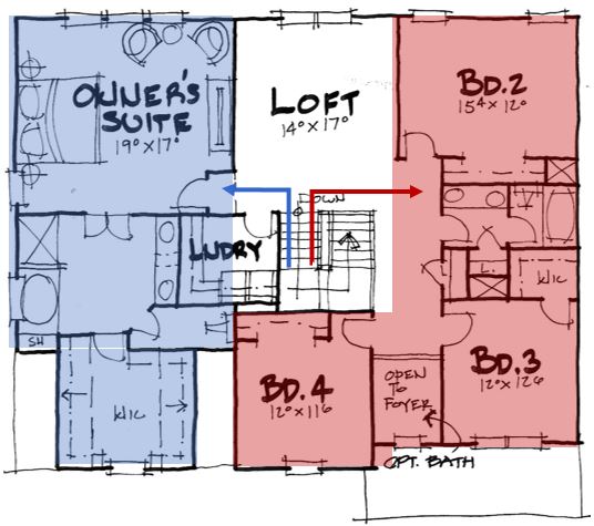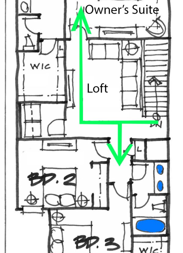 This is a term I borrowed from Ghost Busters, and it has to do with crossing paths in a floor plan. In addition to the above-mentioned path to the master, the path to each kids’ bedroom room and their bathroom needs to be a direct as possible and not cross into other paths like that to the master.