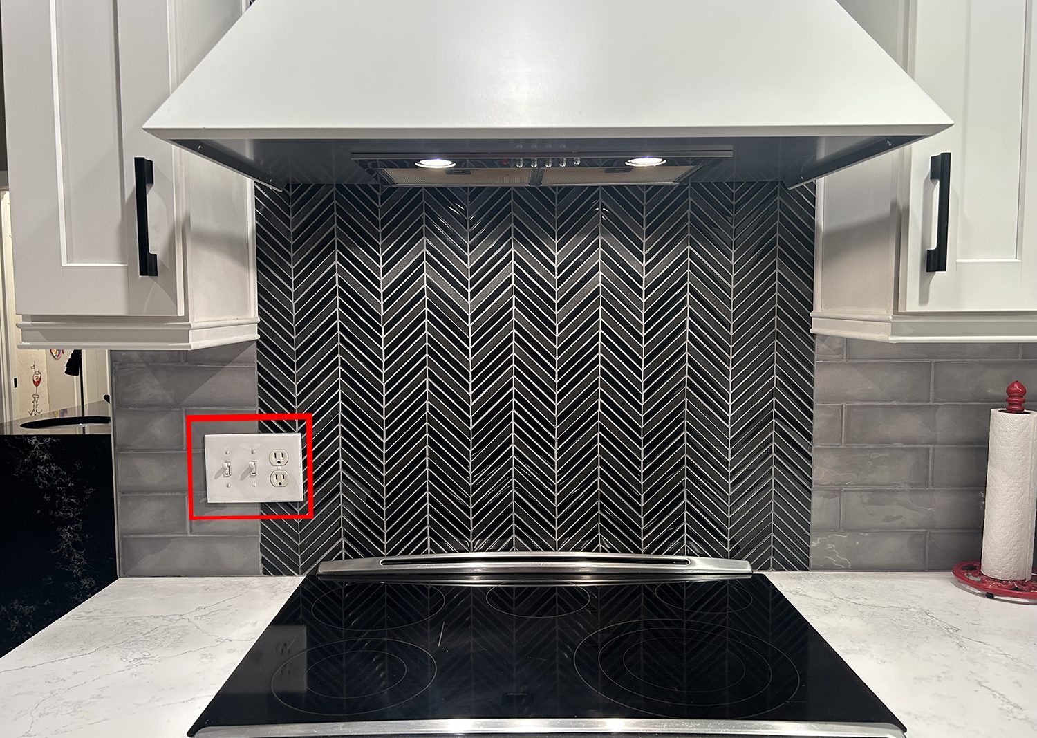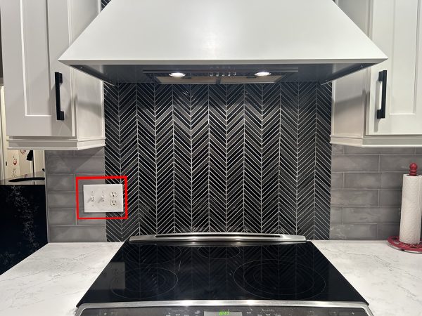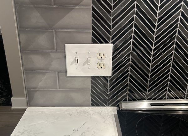 The ultimate foul is when there is a change in the backsplash pattern and material – like behind the stove and it too is ignored when selecting the electrical devices color. In this example, the mismatched device – which was actually an outlet and set of switches lapped over both tile patterns.