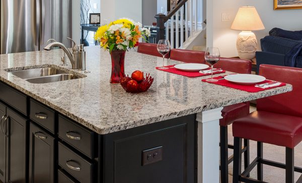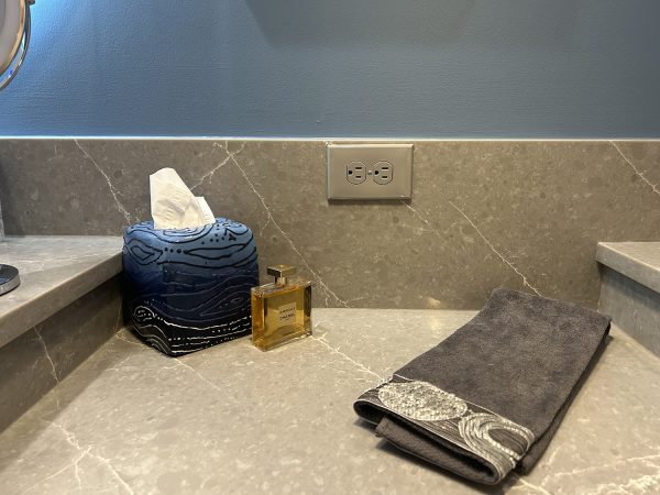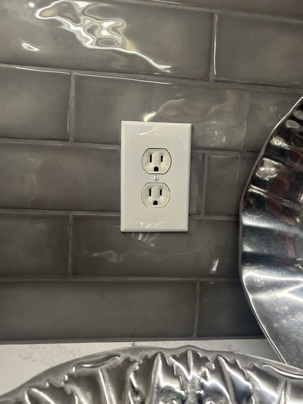 A recent bathroom remodel included all new quartz countertops and backsplash. In this application, there was a knee space between two vanities at a lower level. The 6” backsplash behind each sink was carried straight across the drop area creating a large backsplash of 10”. Sadly, in the sea of variegated gray was a bright white outlet.
