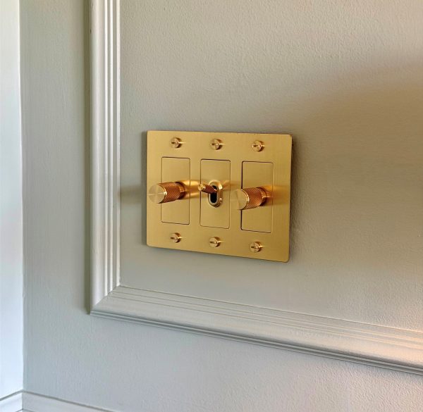 Alternatively, instead of matching to the wall color, you can elevate your switchplate not only visually, but tactically as well to coordinate with the finishes of the room like this brass piece with a knurled switch and knobs.