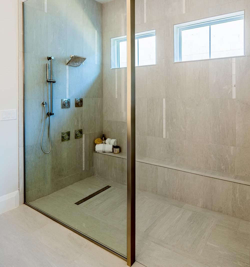 Eliminating tripping hazards in a room that gets wet is a great strategy. This includes a zero-entry into the shower. You can add grab bars now – or blocking for grab bars later. Fortunately grab bars have come a long way in design and finish to avoid that institutional feel. Adding a seat and a handheld shower head makes the shower more user friendly and more luxurious.